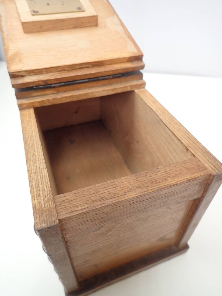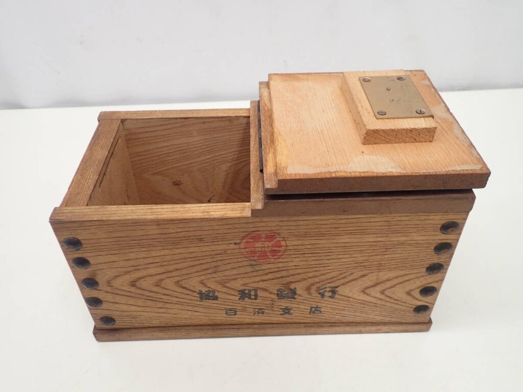 協和銀行木製錢箱,表面印有年代章及字樣
